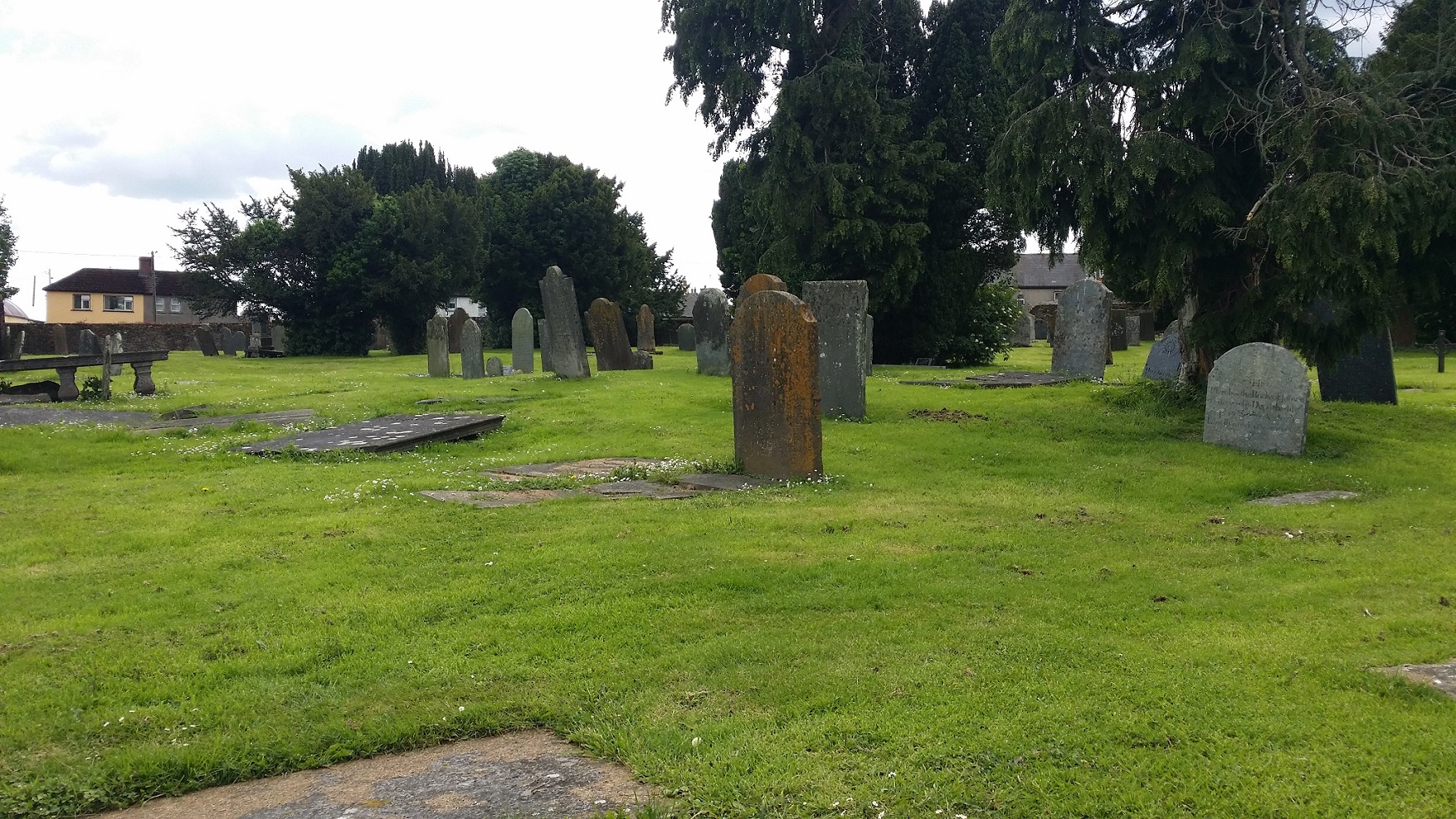 Viel interessanter als die Kathedrale war der Friedhof nebenan. Dieser sah aus, als hätte man ihn aus einer Filmszene herausgeschnitten, um ihn dann an den Rand der Stadt zu platzieren. Aus einer von einer Steinmauer umgebenen, grasbewachsenen Fläche ragten windschief alte Grabsteine und einige Nadelbäume heraus. Fehlte nur noch Mondschein und eine Nebelmaschine und das Bild wäre perfekt gewesen. Wir besuchten den Grabstein, unter dem Diarmuid Mac Murchadha angeblich begraben war. Der Stein selbst war einigen Vandalen zum Opfer gefallen, die anscheinend nicht mit den vergangenenen Entscheidungen des Mannes, der darunter lag, einverstanden gewesen waren.